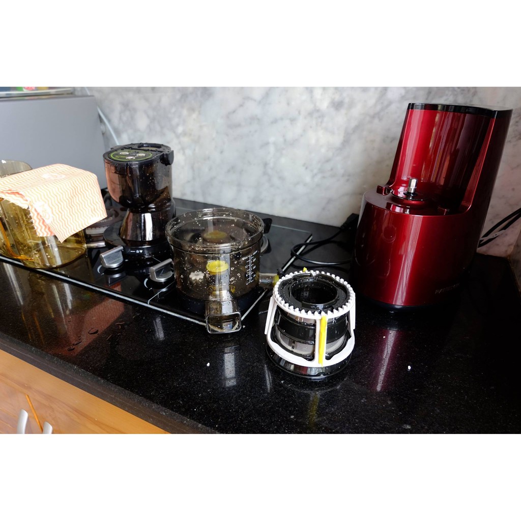 - Tốc độ vòng quay tối ưu giúp tách được lượng nước trái cây nhiều hơn, do đó phần bã cũng sẽ kiệt hơn so với máy ép dạng quay ly tâm.