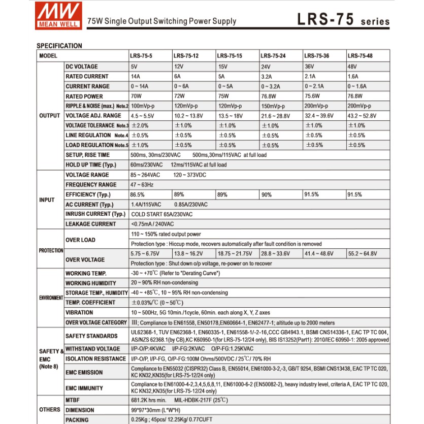 _Meanwell LRS 75W 24V Một đầu ra kèm theo Các tính năng: