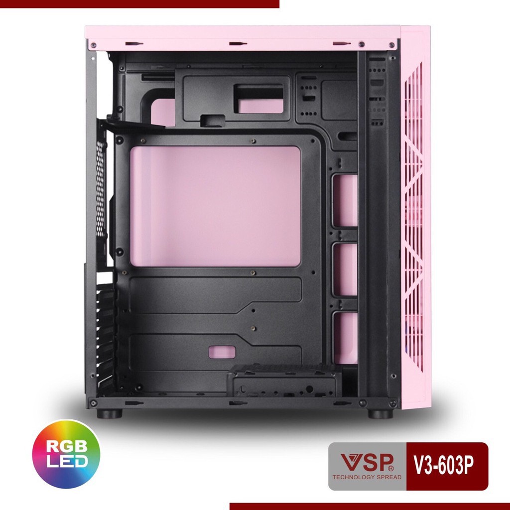 Case VSP V3-603P Và V3-603W Có Sẵn LED RGB Và nắp hông trong suốt.♻️ Case VSP V3-603 Có mặt hông được thiết kế trong suốt, có thể nhìn phía trong. Hiệu ứng ánh sáng LED RGB đi kèm phía trước nổi bật với những đường kẻ ZICZAC .