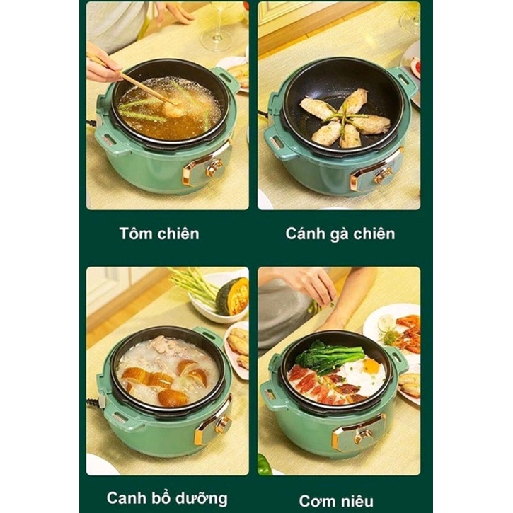 - Lần đầu tiên có 1 chiếc nồi áp suất ( hầm cháo, hầm xương củ quả, hầm thịt... cực kỳ nhanh) lại có thể chiên xào, nấu cơm, và tích hợp nấu nẫu được ( vì có tặng kèm chiếc nắp đậy thứ 2)