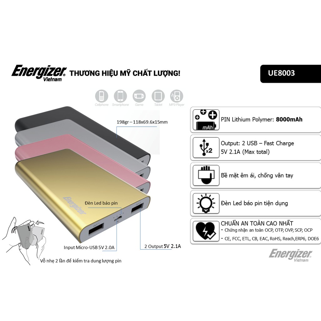 Giới thiệu Pin sạc dự phòng Energizer 8000mAh Li-Po 2 cổng Output - UE8003 (Vàng Đồng)