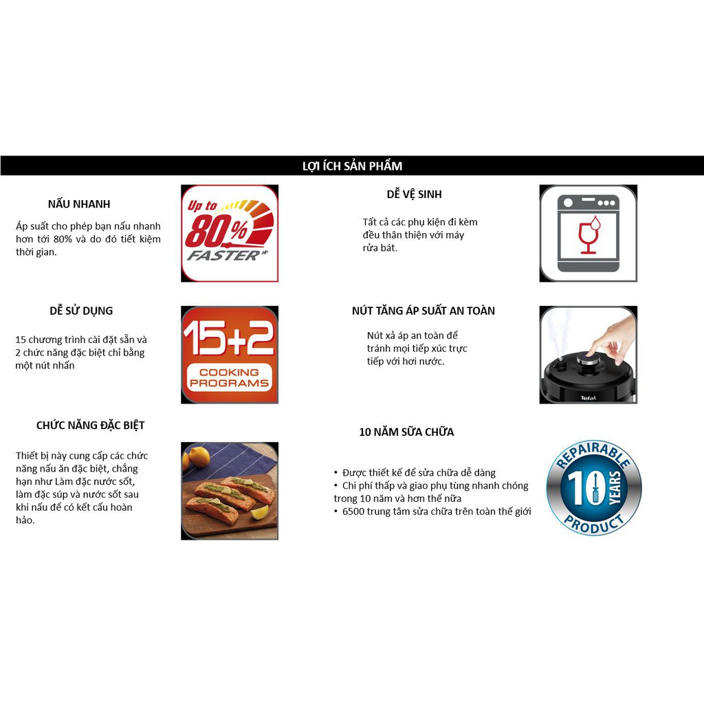 Bên cạnh đó, khi mua nồi áp suất điện Tefal 6L này bạn sẽ nhận được các phụ kiện kèm theo như: cốc đong, thìa xới cơm, thìa súp và xửng hấp.