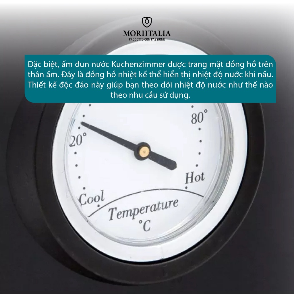 + Đặc biệt, ấm đun nước Kuchenzimmer được trang mặt đồng hồ trên thân ấm. Đây là đồng hồ nhiệt kế thể hiển thị nhiệt độ nước khi nấu. Thiết kế độc đáo này giúp bạn theo dõi nhiệt độ nước như thế nào theo nhu cầu sử dụng.