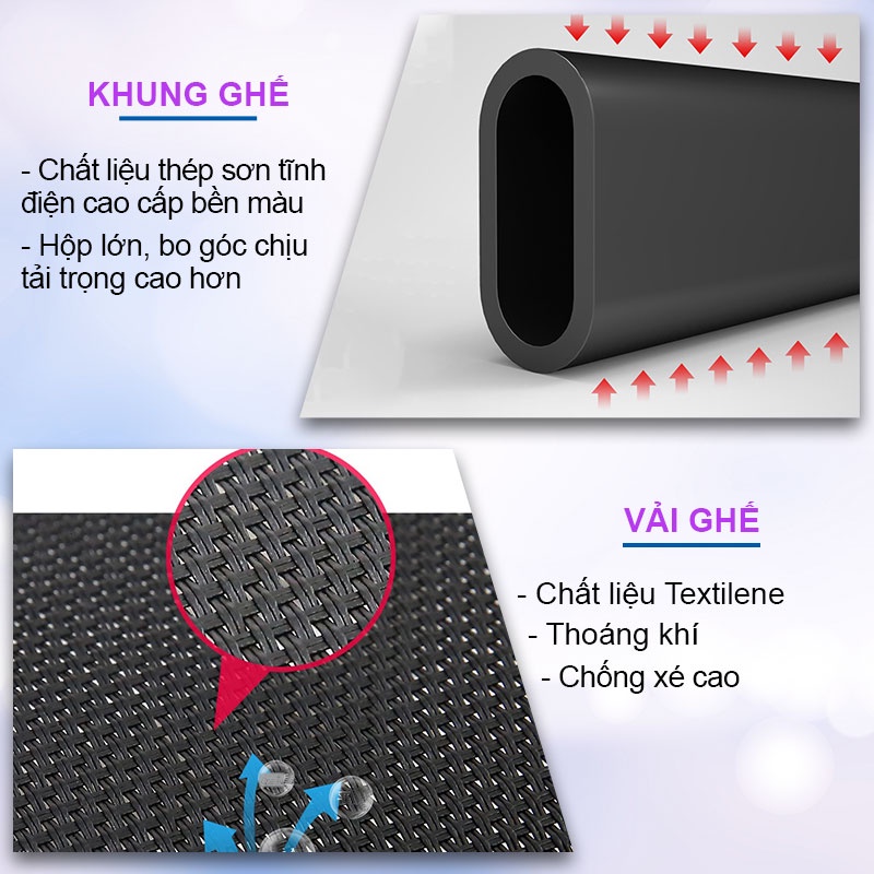✔️ Chất liệu mặt ghế : Vải lưới tixtilen cao cấp, thoáng mát.