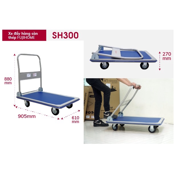 - Xe đẩy hàng sàn thép 4 bánh FUJIHOME SH300 - Xe được thiết kế gấp gọn giúp tiết kiệm diện tích khi cất giữ cũng như vận chuyển đến các địa điểm sử dụng khác nhau.