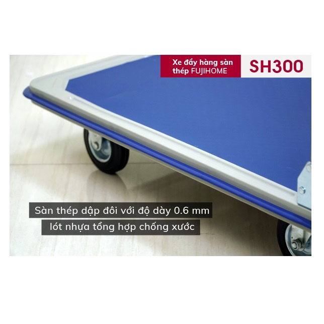 Xe đẩy hàng sàn thép 4 bánh FUJIHOME SH300, tải trọng 200kgĐây là dòng xe 4 bánh mới ra mắt với màu sắc kem/xanh bắt mắt phổ thông, chất liệu thép và mức độ hoàn thiện cao cấp, tải trọng 200kg phổ biến và được sử dụng nhiều hiện nay. Xe đẩy hàng sàn thép FUJIHOME SH300 là dòng sản phẩm này có thiết kế 4 bánh xe vững chãi. Sàn rộng giúp vận chuyển hàng hóa cồng kềnh, khối lượng lớn. Thiết kế bo tròn góc giúp giảm tác động khi va chạm, an toàn cho người và vật. Mặt sàn được tạo vân nhám tăng ma sát, tránh rơi đổ hàng hóa khi vận chuyển. Tay cầm xe có khả năng gập xuống mặt sàn, gọn gàng, tiết kiệm diện tích.