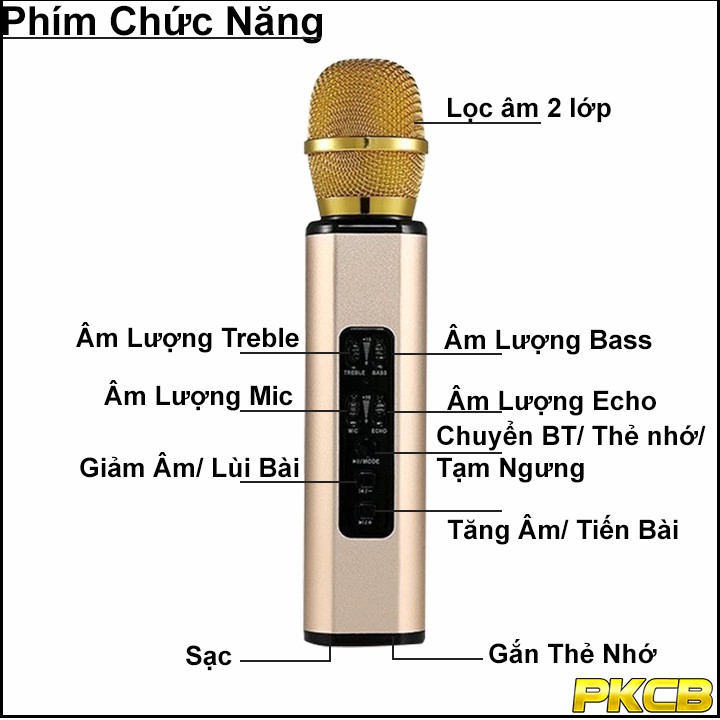 Micro Karaoke Bluetooth nhập khẩu cao cấp PKCB204 có nút chỉnh Echo, Bass, Treb chuyên nghiệp cho người dùng.