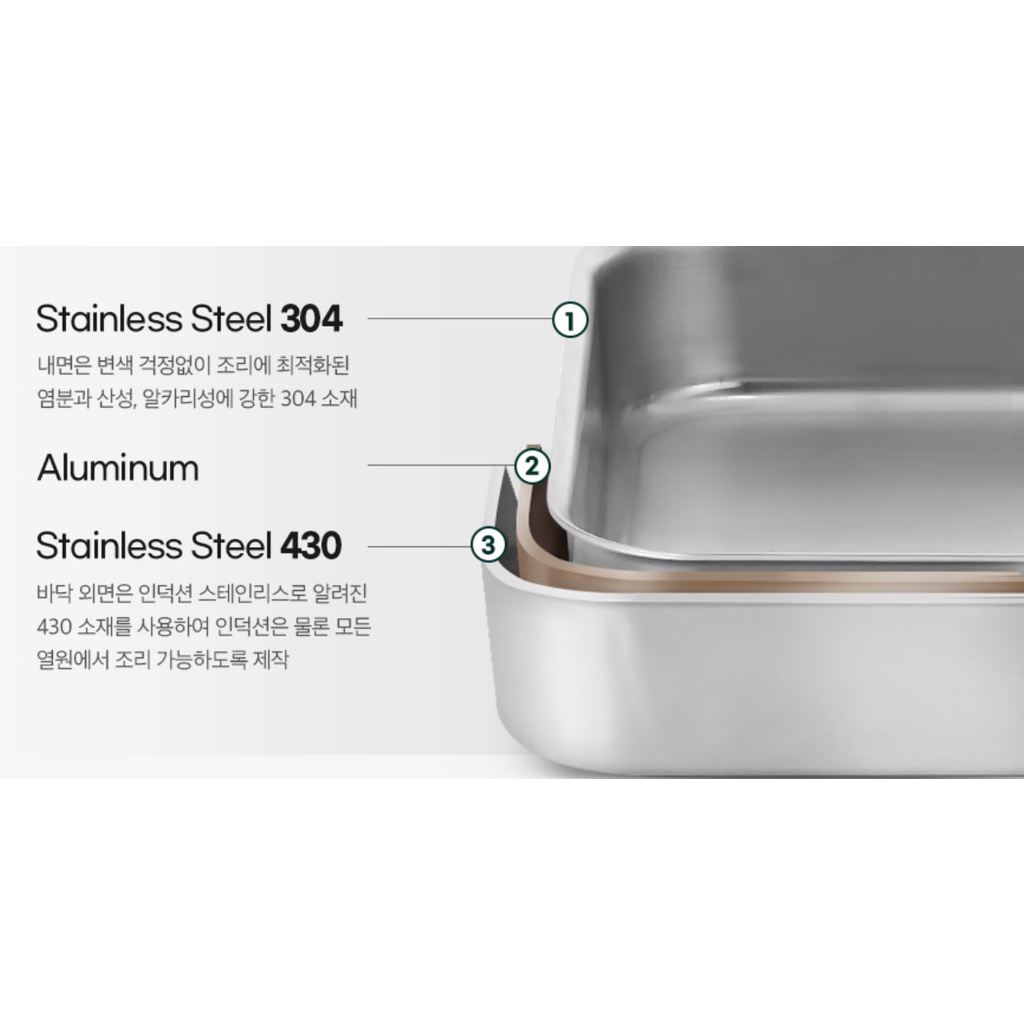 👉 Sản phẩm có cấu trúc 3 lớp với lòng chảo được làm hoàn toàn bằng thép không gỉ 304 bọc nhuôm và bề mặt đáy được làm bằng thép 403 không gỉ cảm ứng, do đó sản phẩm có thể được nấu trong mọi nguồn nhiệt cũng như bếp cảm ứng.