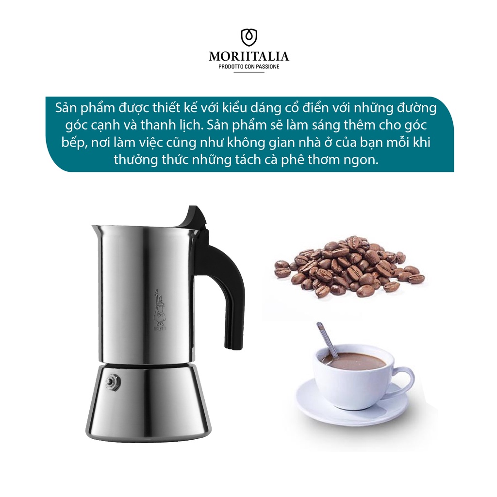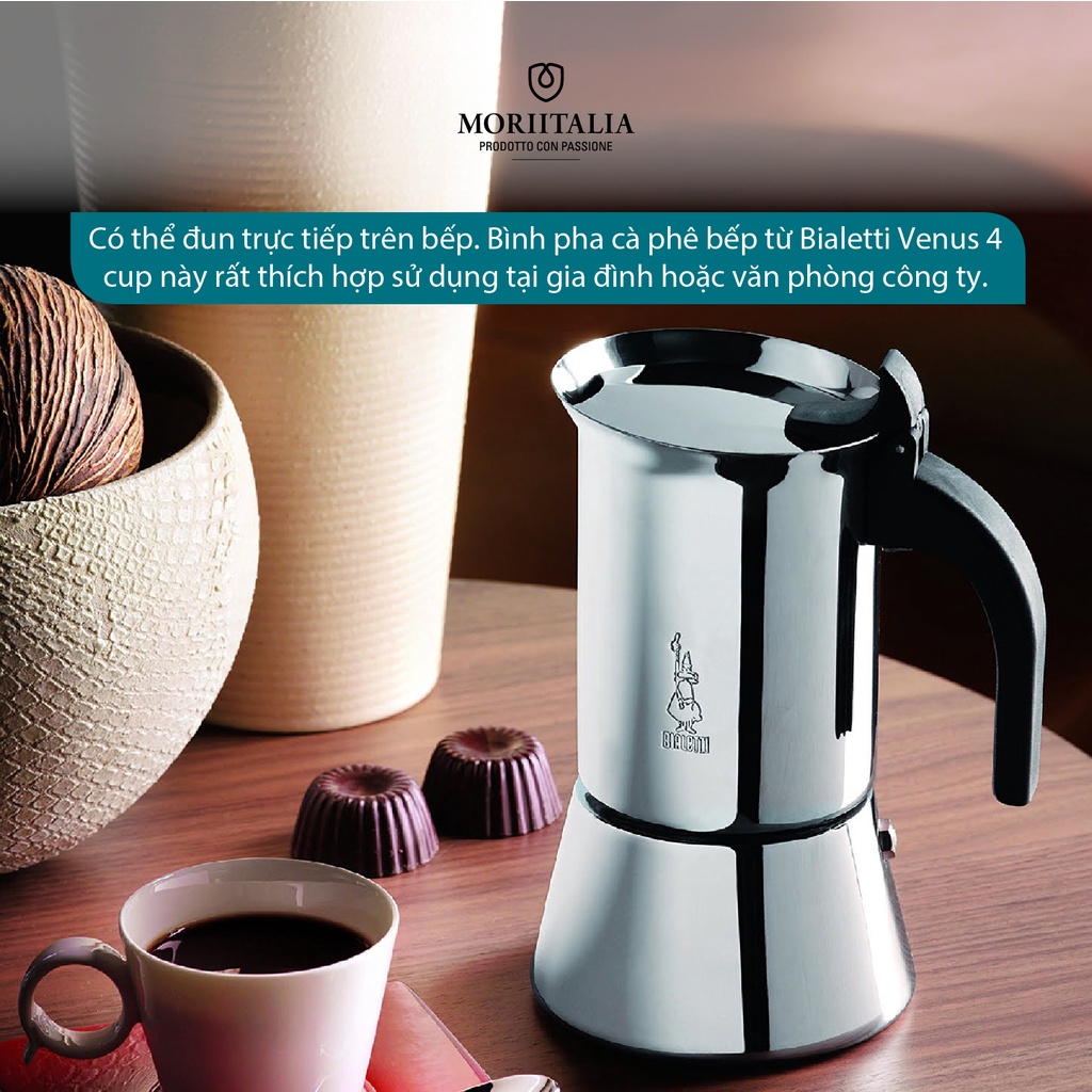 - Có thể đun trực tiếp trên bếp. Bình pha cà phê bếp từ Bialetti Venus 4 cup này rất thích hợp sử dụng tại gia đình hoặc văn phòng công ty.