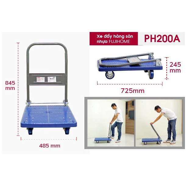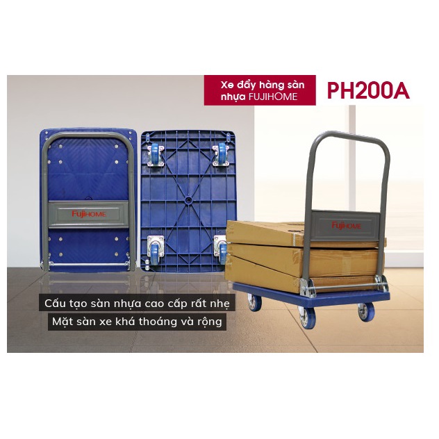 - Xe đẩy hàng sàn nhựa FUJIHOME PH200A là dòng sản phẩm mang đến nhiều tiện ích cho người sử dụng và đáp ứng được nhu cầu vận chuyển hàng hóa nặng, thiết kế của sản phẩm chắc chắn, độ bền cao.