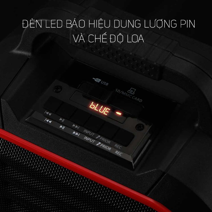 Các chức năng của loa được bố trí ở mặt trên và mặt sau loa, mặt trước là một màn hình nhỏ giúp theo dõi dung lượng pin, chức năng đang sử dụng, thời lượng bài hát. Chức năng back- play/pause - next , chức năng ghi âm " REC", " Prior" dùng cho MC; phía trên màn hình là các cổng cắm usb và TF card.