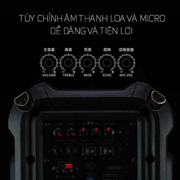 Mặt sau có các chức năng: mic1/mic2 dùng để cắm mic dây, " Power" công tắc tắt mở thiết bị, công suất tắt mở đèn LED " Lights" , " Charge" đèn báo sạc, cổng AUX cỡ 3.5mm để cắm cáp và nhận âm thanh phát từ các thiết bị. Cổng DC IN 12V có 2 cực "+" và "-" là nơi chúng ta có thể đấu thêm một bình accu 12V để tăng thêm thời gian phát mà không cần dùng điện. Cuối cùng là các chức năng chỉnh âm thanh: treble, bass, echo, volume, volume của mic.