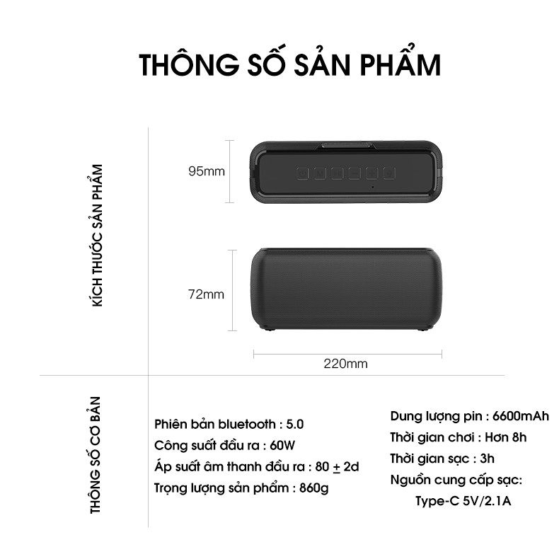 Loa bluetooth không dây 60W công suất lớn chống nước IPX5 sạc nhanh Type C PKCB PF1007 Hàng chính hãngTHÔNG TIN SẢN PHẨM