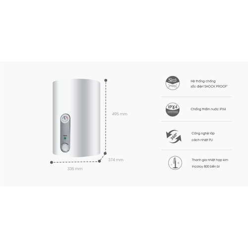 Máy nước nóng đáp ứng khả năng chống thấm nước IPX4 đảm bảo máy hoạt động lâu bền ở những nơi ấm ướt.