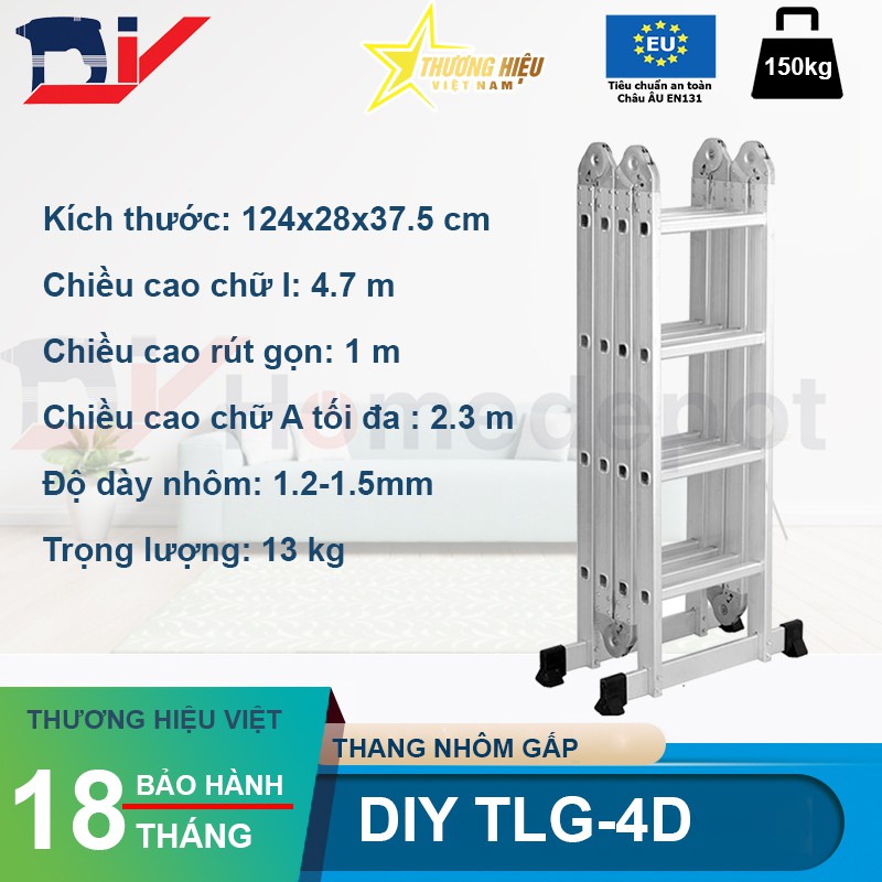 Thang nhôm gấp đoạn DIY TLG-4D là dòng thang nhôm thuộc thương hiệu Việt Nam được sản xuất và ra mắt đầu tiên vào thagns 1 -2018, đây là thang gấp đa năng được làm từ hợp kim nhôm, có khả năng biến hình bởi thang được kết cấu với 4 khúc thang được kết nối với nhau bằng những chốt khóa tự động đặc biệt an toàn. Có thể sử dụng thang dưới các tư thế như dáng chữ A, chữ I, chữ W, chữ L hay chữ U.Thang nhôm bốn đoạn DIY TLG-4D