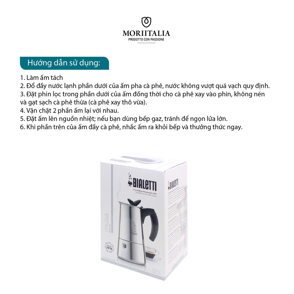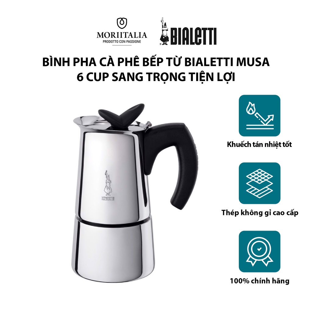 Bình pha cà phê bếp từ Bialetti Musa 6 cup sang trọng tiện lợi Moriitalia 990004273Là một thương hiệu Ý được thành lập vào năm 1919, bởi Alfonso Bialetti-chuyên sản xuất máy pha cà phê, dụng cụ nấu ăn và các thiết bị nhà bếp nhỏ.