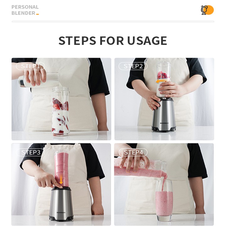 Lắp nắp xay, úp ngược, vặn chặt Cắm điện, máy sẽ tự động xay khi vặn khớp. Sau khi xay xong, thay nắp để đem ly trái cây ra ngoài