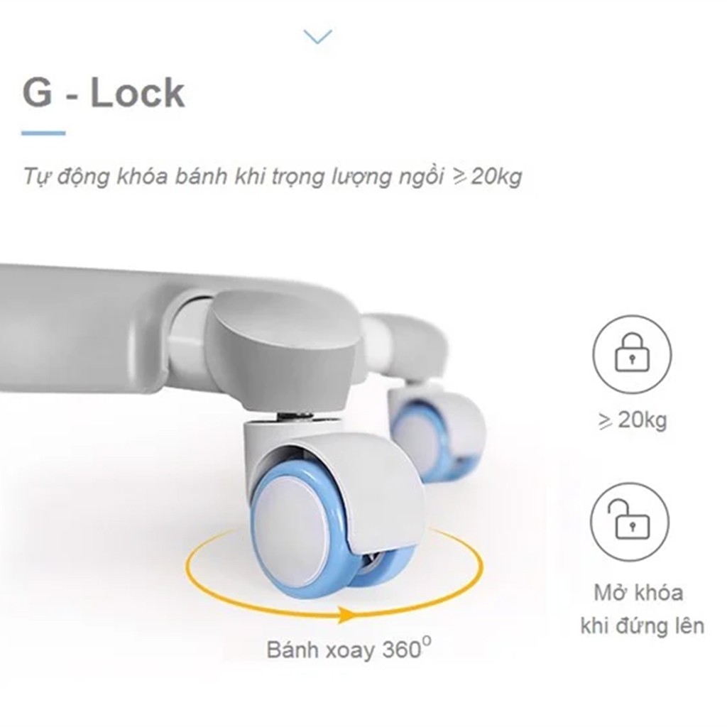 📌 Tính nặng G-Lock tự khoá bánh (khi trọng lượng ≥ 5kg/bánh) Dễ dàng di chuyển khi không ngồi. Khi trẻ ngồi vào, ghế tự động khóa bánh. Khác biệt với ghế người lớn, giúp trẻ ổn định tư thế, học tập trung hơn!
