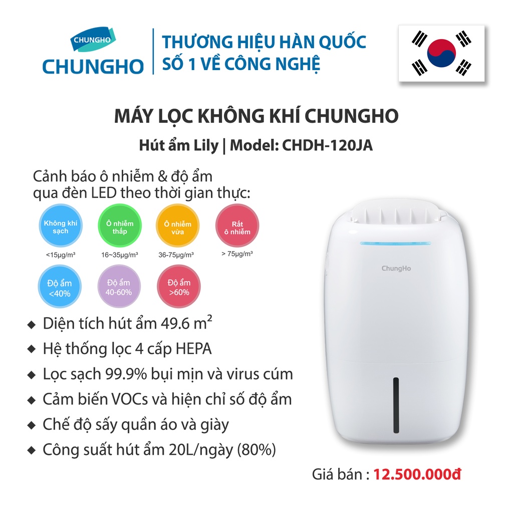 Giới thiệu [Mã ELHA22 giảm 5% đơn 300K] Máy lọc không khí hút ẩm ChungHo Lily CHDH-120JA
