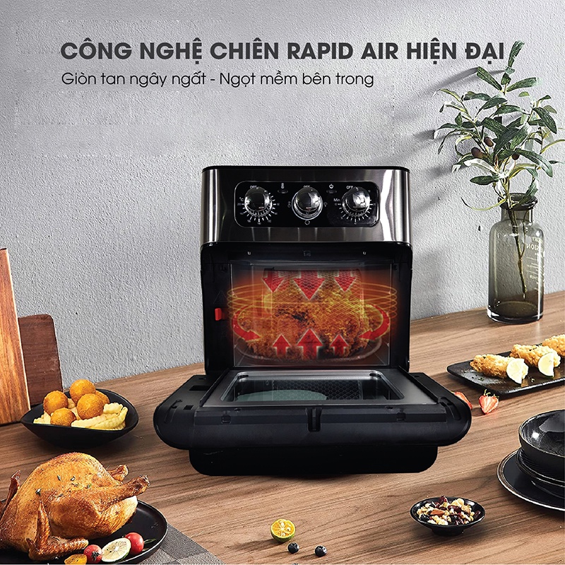 - Hoạt động với công suất 1500W, thiết kế hệ thống lưu thông khí nóng hiện đại giúp món ăn chín thơm ngon,giòn đều, tiết kiệm thời gian và điện năng cho người dùng.