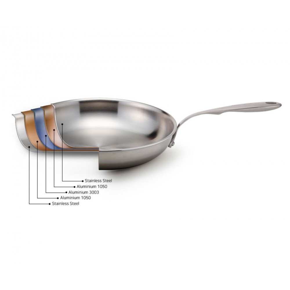 - Lớp trong cùng tiếp xúc với thực phẩm là thép không gỉ ( 18/10) Stalnless Steel , các lớp giữa là nhôm Aluminium (1050), Aluminium (3003) Aluminium (1050), có tác dụng thu nhiệt nhanh tỏa nhiệt đều giúp thực phẩm chín nhanh và chín đều,tiết kiệm nhiên liệu không để nhôm tiếp xúc với thực phẩm.