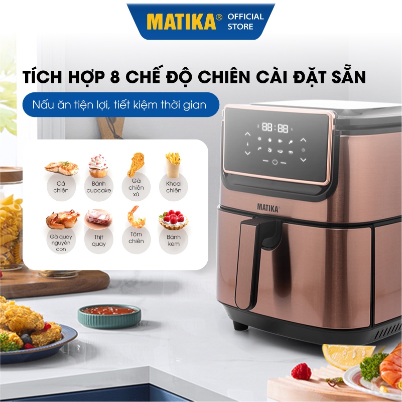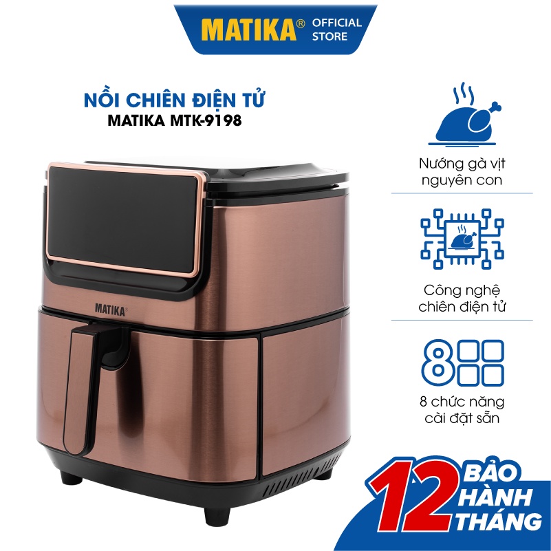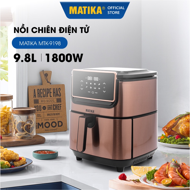 Nồi Chiên Không Dầu Điện Tử MATIKA 9.8L 1800W MTK-9198Nồi chiên không dầu Matika MTK-9198 thiết kế sang trọng tinh tế, bảng điều khiển cảm ứng hiện đại với 8 chế độ nấu được lập trình sẵn hứa hẹn sẽ mang đến những món chiên nướng thơm ngon làm say lòng thực khách.