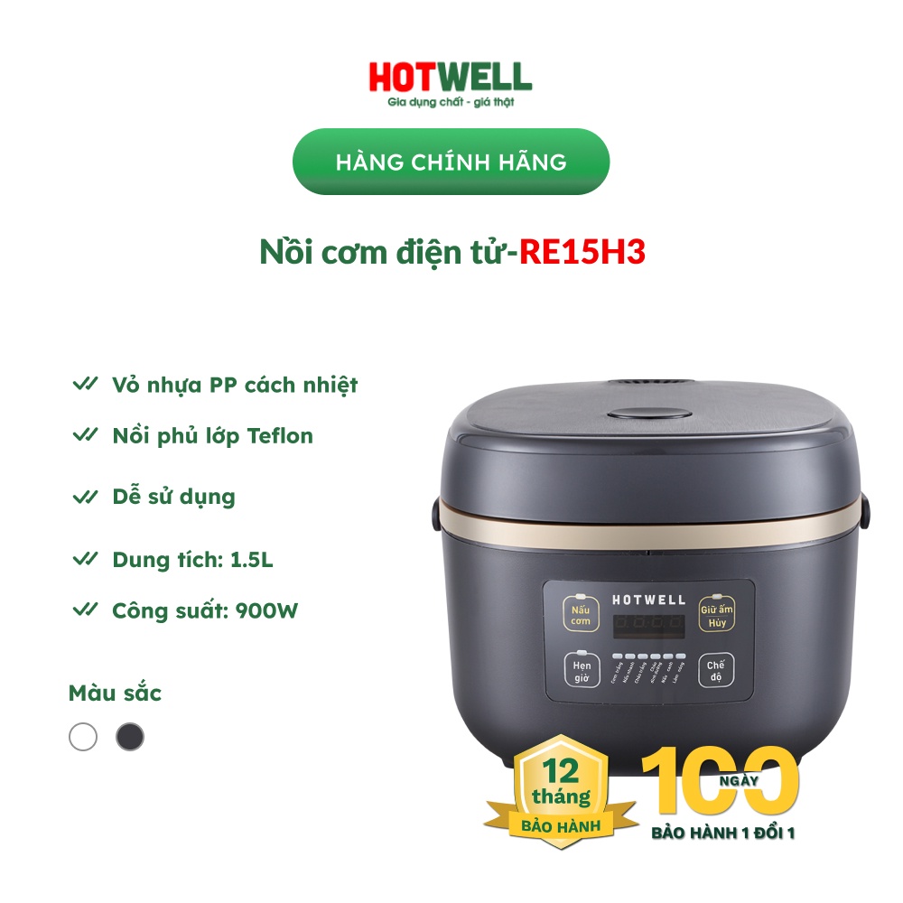 Hotwell là thương hiệu gia dụng Việt thuộc Công ty Cổ phần Masscom Việt Nam - một trong 500 công ty công nghệ lớn nhất Việt Nam. Hotwell là hãng gia dụng đầu tiên có chế độ hậu mãi tuyệt vời chưa từng có: sản phẩm được cam kết bảo hành 1 đổi 1 mới trong 100 ngày sau khi mua cùng thời gian bảo hành lên tới 12 tháng, giúp người mua hoàn toàn an tâm khi dùng Nồi cơm điện tử Hotwell mã RE15H3.Nồi cơm điện tử Hotwell mã RE15H3 là lựa chọn hoàn hảo cho bữa cơm gia đình. Với kiểu dáng hiện đại, chức năng đa dạng, nồi đáp ứng tất cả các nhu cầu của mọi thành viên trong gia đình từ nấu cơm, nấu cháo/sữa… đến nấu canh, làm soup,… Bạn sẽ tiết kiệm được rất nhiều chi phí sắm sửa đồ gia dụng, chi phí điện năng khi sử dụng Nồi cơm điện tử Hotwell mã RE15H3.
