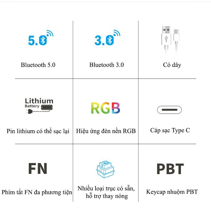 🍂 Loại sản phẩm : bàn phím cơ chế độ kép không dây bluetooth 5.0/3.0 và có dây USB-A To Type-C