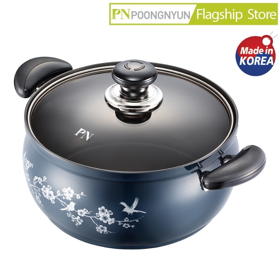 Nồi nhà bếp (loại nồi Casserole size lớn) nhôm thuần khiết cao cấp hiệu PoongNyun Series Fosya Mei IH dầy 2.5mm chống dính, chống trầy xước màu xanh đen họa tiết hoa mai với công nghệ tráng men hiện đại “Hard Anodizing” không tróc men, chống gỉ sét, chống ăn mòn, giữ và gia nhiệt lâu hơn giúp thức ăn mau chín tiết kiệm thời gian và nhiên liệu, thiết kế nắp kiếng chịu nhiệt chống trào, 2 tay cầm chống nóng, sử dụng trên bếp gas, bếp hồng ngoại, bếp từ, gồm 02 món (1 nồi và 1 nắp kiếng chịu nhiệt 24cm).• Xuất xứ thương hiệu: Hàn Quốc • Sản xuất tại: Made in Korea • Đường kính đáy : 24cm
