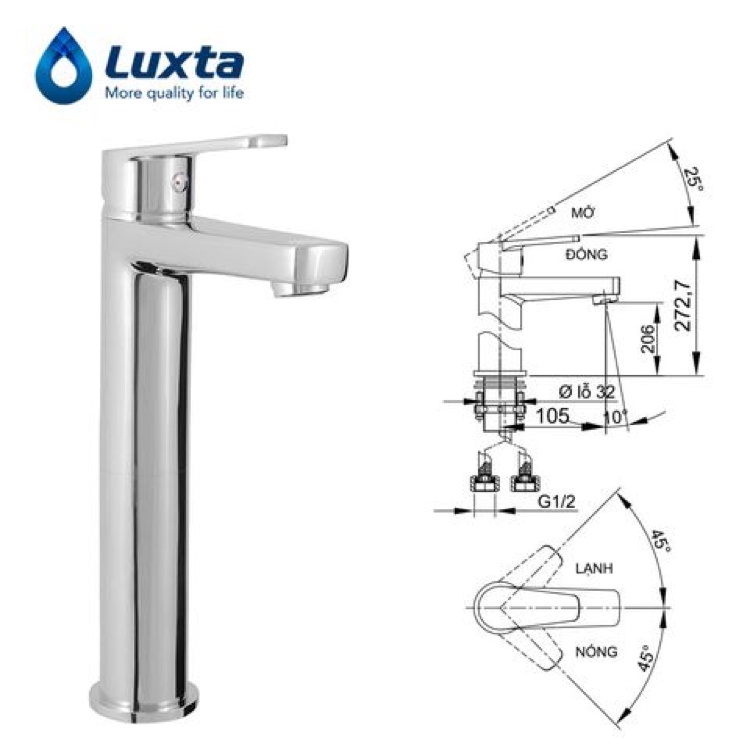 Vòi Lavabo Nóng Lạnh Luxta L1205B Vòi rửa mặt là thiết bị cần thiết được sử dụng phổ biến trong nhà vệ sinh, phòng tắm. Khi bạn thiết kế không gian của mình, bạn có thể chọn kết hợp kiểu dáng của vòi với tất cả các phụ kiện của bạn, từ thanh treo khăn và móc áo cho đến giá treo khăn giấy vệ sinh. Cho nên việc lựa chọn chiếc vòi Lavabo phù hợp là điều mà gia chủ băn khoăn. Hãy cùng VLXD XANH cùng tìm hiểu về Vòi Lavabo Nóng Lạnh Luxta L1205B đang được nhiều Khách hàng ưa chuộng hiện nay nhé! Giới thiệu về Vòi Lavabo Nóng Lạnh Luxta L1205B: Vòi Lavabo Nóng Lạnh Luxta L1205B sở hữu kiểu dáng nhỏ gọn, đường nét thiết kế vuông vức, tinh tế đem lại vẻ đẹp sang trọng và đẳng cấp cho các mẫu chậu rửa được lắp đặt. Được sản xuất trên dây chuyền công nghệ hiện đại, tiên tiến nhất, tích hợp các tính năng thông minh mang đến nhiều tiện ích sử dụng tối ưu. Ưu điểm và chức năng nổi bật của Vòi Lavabo Nóng Lạnh Luxta L1205B: Vòi Lavabo Nóng Lạnh Luxta L1205B cao cấp tại VLXD XANH - Vòi Lavabo Nóng Lạnh Luxta L1205B được thiết kế tỉ mỉ đến từng góc độ cho ra bộ khung vững chãi, có khả năng tiết kiệm nước tốt nhất, đem đến không chỉ giá trị thẩm mỹ mà còn là chất lượng bền bỉ theo năm tháng phù hợp với không gian phòng tắm nhà bạn - Tay gạt bằng chất liệu kim loại cao cấp, thiết kế thẩm mỹ, tinh tế - Những đường nét vuông vức, gọn ghẽ cùng màu xi mạ Chrome-Niken chủ đạo, Vòi Lavabo Nóng Lạnh Luxta L1205B với ánh sáng tự nhiên, tạo nên một sự cộng hưởng hoàn hảo để làm bừng sáng không gian phòng tắm của bạn. - Vòi Lavabo Nóng Lạnh Luxta L1205B sử dụng nguyên liệu đồng thau nguyên khối cao cấp không chứa chì giúp bảo vệ môi trường và sức khỏe người tiêu dùng, ngoài ra còn có tác dụng chống trầy xước, chống bám bẩn tối ưu - Lõi van bằng gốm có độ cứng và bền cao - Chân và vòng chặn đế bằng đồng tạo nên sự cứng vững cho vòi, 2 vít inox tăng đơ, siết chặt giữa vòi và bệ giá đỡ - Mặt bên trong của vòi mịn nhẵn tạo nên đường chảy mượt mà - Đầu vòi xả có lưới tạo bọt khí tránh bắn và cực kỳ tiết kiệm nước - Các phần đầu ốc được làm bằng đồng cực kỳ chắc chắn, không rò nước. Công dụng của Vòi Lavabo Nóng Lạnh Luxta L1205B: - Giúp không gian nhà tắm nhà bạn thêm sang trọng tinh tế, góp phần mang hơi thở hiện đại vào nhà tắm nhà bạn. - Vòi Lavabo Nóng Lạnh Luxta L1205B giúp bạn vừa có thể tiết kiệm nước mà vẫn có thể tận hưởng cảm giác thư giãn tuyệt vời ngay trong chính căn nhà của mình. - Có nhiệm vụ chính là để cung nước tùy theo nhiệt độ mong muốn của người sử dụng, tiện lợi hơn rất nhiều so với vòi Lavabo chỉ có 1 chế độ lạnh. Thông số kỹ thuật: Tên sản phẩm: Vòi Lavabo Nóng Lạnh Luxta L1205B Thương Hiệu: LUXTA Xuất xứ: Việt Nam Công nghệ sản xuất: Hàn Quốc Chức năng: Rửa tay, rửa mặt Chất liệu: Đồng thau nguyên chất cao cấp Màu: Bạc sáng bóng Nguồn nước: Nóng - Lạnh Lớp mạ: Chrome - niken Áp lực nước: 0.07MPa~0.75MPa Công nghệ: Tiết kiệm nước Luxta Cách sử dụng Vòi Lavabo Nóng Lạnh Luxta L1205B: - Để sử dụng nước lạnh bạn chỉ cần gạt tay gạt qua bên có chấm xanh dương (biểu tượng của nước lạnh) sau đó gạt lên để mở nước. - Để sử dụng nước nóng bạn chỉ cần gạt tay gạt qua bên có chấm đỏ (biểu tượng của nước nóng) sau đó gạt lên để mở nước. Lưu ý khi sử dụng Vòi Lavabo Nóng Lạnh Luxta L1205B: Nếu nhà bạn có trẻ nhỏ hãy luôn phải thật cẩn trọng với vòi điều chỉnh nhiệt độ của Vòi Lavabo Nóng Lạnh Luxta L1205B. Vì trẻ con rất hiếu động, trong khi rửa tay thường nghịch phá vòi điều chỉnh và vô tình chuyển sang mức nhiệt độ cao hay thấp. Để đảm bảo an toàn cho trẻ nhất hãy luôn chú ý quan sát và tránh để <4 tuổi sử dụng Vòi Lavabo Nóng Lạnh Luxta L1205B. Vòi Lavabo Nóng Lạnh Luxta L1205B được khách hàng đáng giá cao về độ bền và độ sáng bóng lâu đài kết hợp những thiết kế kiểu dáng đẹp, sang trọng. Với thương hiệu Luxta chính hãng do VLXD XANH phân phối bạn có thể yên tâm chất lượng sản phẩm khi sử dụng.Giá WYZ