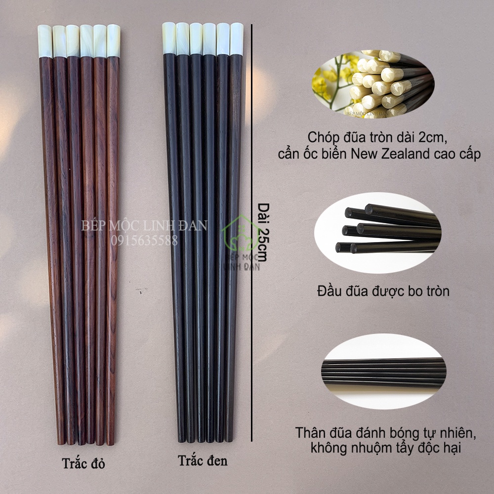 - Chất liệu: Thân đũa sử dụng gỗ Trắc - là loại gỗ quý và nổi tiếng bởi chất gỗ dai và rắn chắc, tom gỗ mịn, có khả năng “miễn dịch” với mối mọt và cong vênh do tác động của môi trường. Chóp đũa cẩn ốc biển nhập khẩu cao cấp.