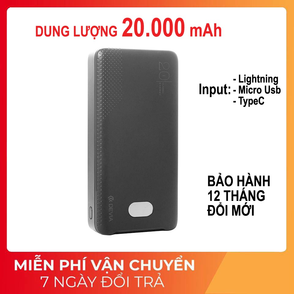Điện Thoại & Phụ Kiện > Phụ kiện > Sạc dự phòng & Pin > Sạc dự phòng || [Mã BMBAU50 giảm 10% đơn 99K] Pin dự phòng Devia 20.000 mAh có LED 3 cổng TypeC/Lightning/MicroUSBCòn hàng