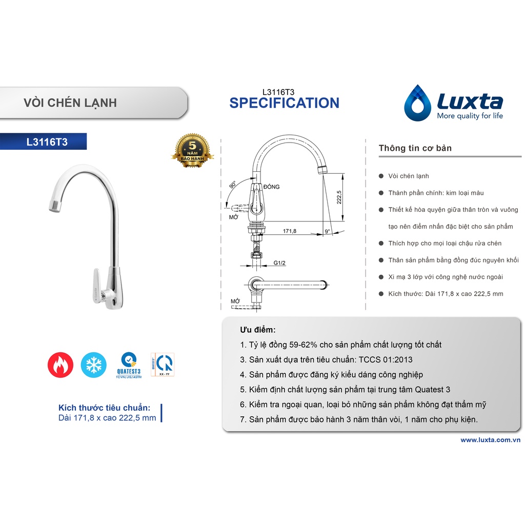 [Mã BMBAU50 giảm 10% đơn 99k] Vòi chén lạnh Luxta cao cấp L3116T3 -VLXD XANH