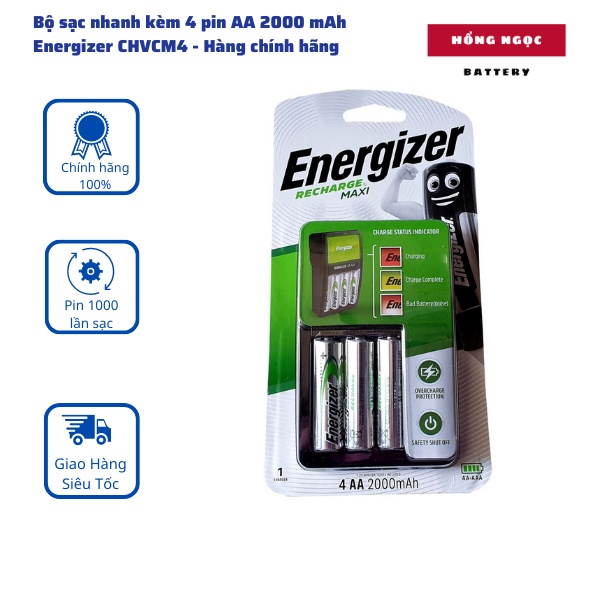 Bộ Sạc Energizer CHVCM4 bao gồm một máy sạc và 4 pin AA chính hãng công suất 2.000 mAh. Pin trong máy đã được sạc đầy pin khách hàng mua về sẵn dùng, khi pin báo yếu thì đem ra sạc đầy rồi sau đó tiếp tục dùng. Làm như vậy giúp kéo dài tuổi thọ pin.