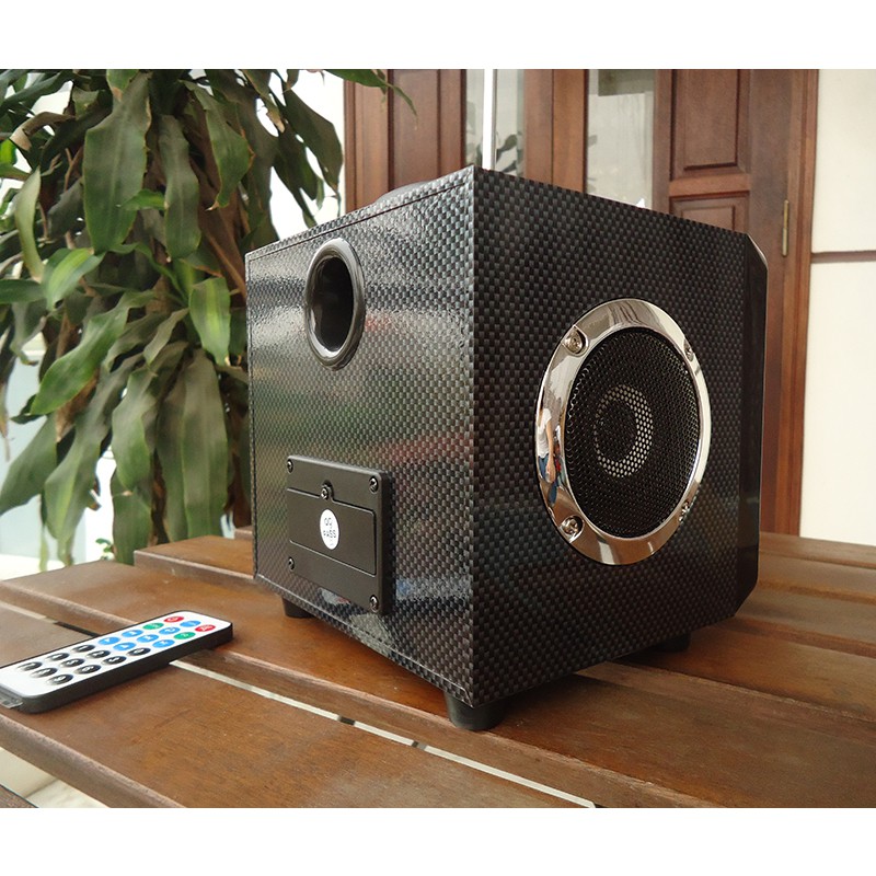 Thiết kế loa hình vuông với mặt trước là 1 màn hình đèn Led sống động và các phím điều kiển, phím tang giảm âm lượng, cổng cắm USB, cổng cắm thẻ nhớ. Cạnh trái và cạnh phải là 2 loa Tress, mặt dưới là loa Bass, mặt trên là anten thu FM và tay cầm loa rất thuận tiện khi mang loa di chuyển tới mọi địa điểm mà bạn thích.