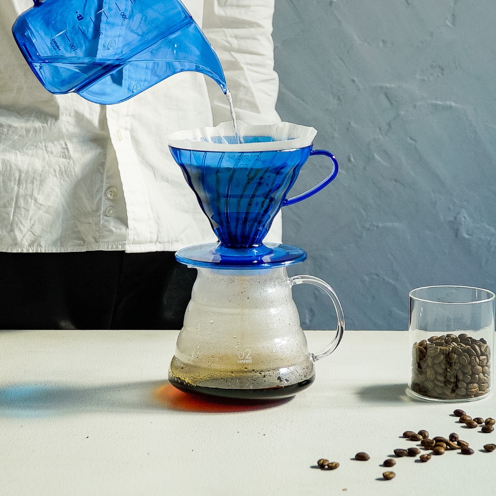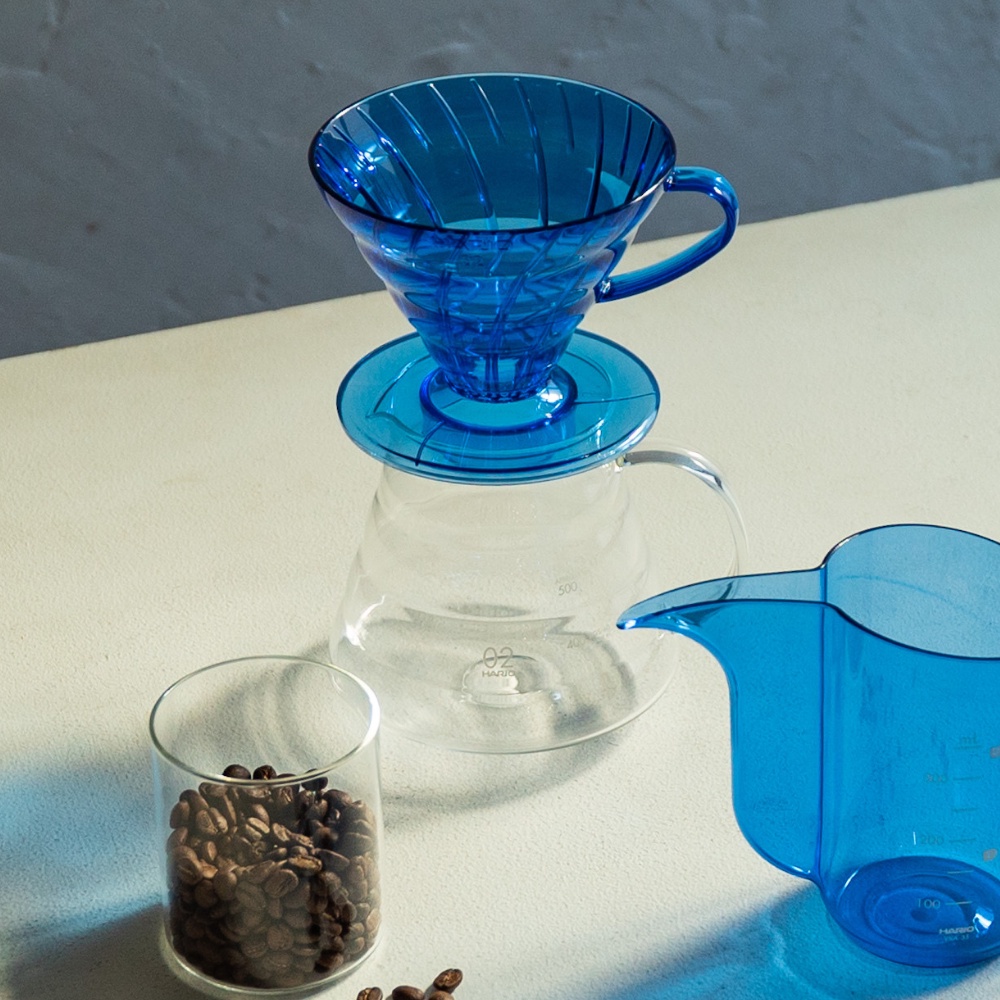 Phễu pha V60 lừng danh của Hario với màu xanh Cobalt cá tính, nằm trong bộ sưu tập JUICEE 2021 - Sắc màu nhiệt đới.Mã: 4977642723306