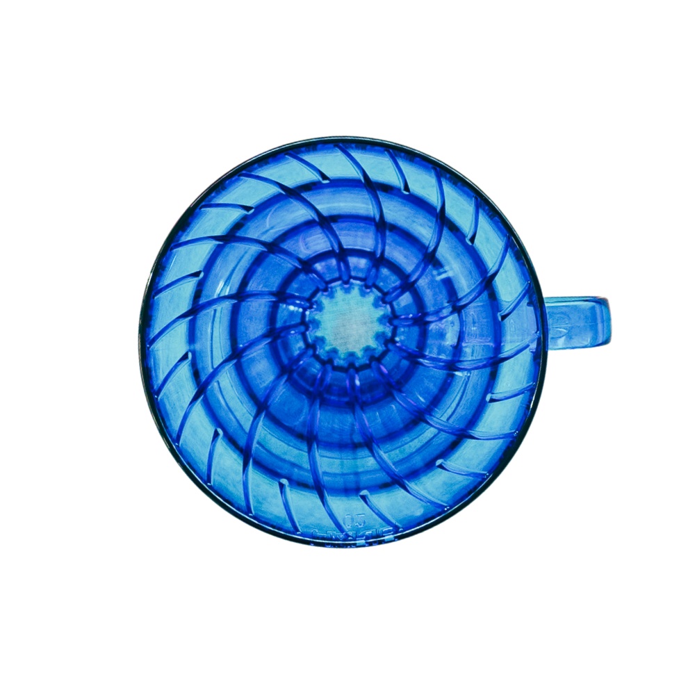 Phễu được làm bằng nhựa AS (chịu nhiệt 90 độ C), phễu có màu xanh Cobalt trong suốt, thiết kế đẹp mắt, sang trọng. Mặt trong có các đường vân giúp không khí đối lưu, giúp nước thẩm thấu vào cà phê và chảy đều