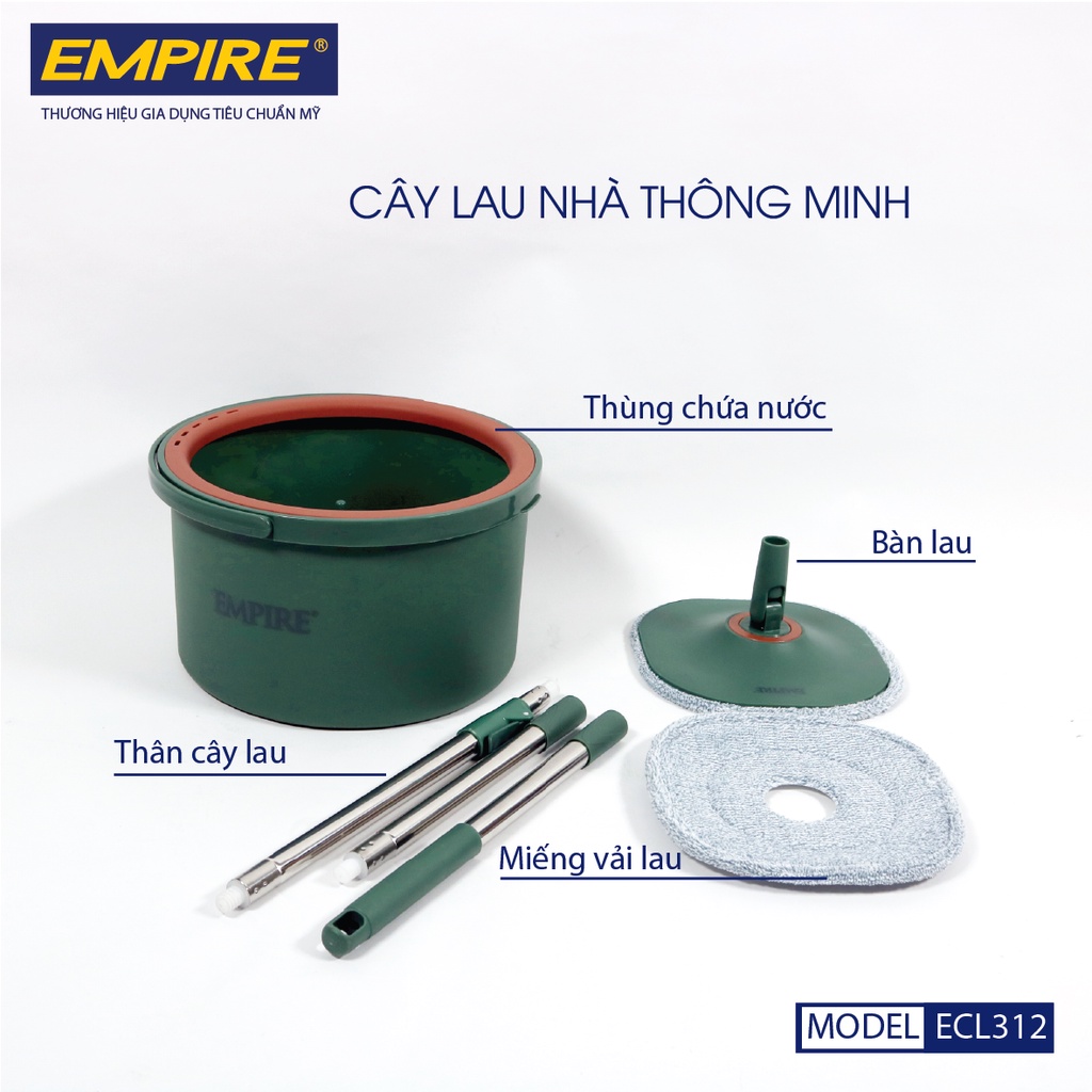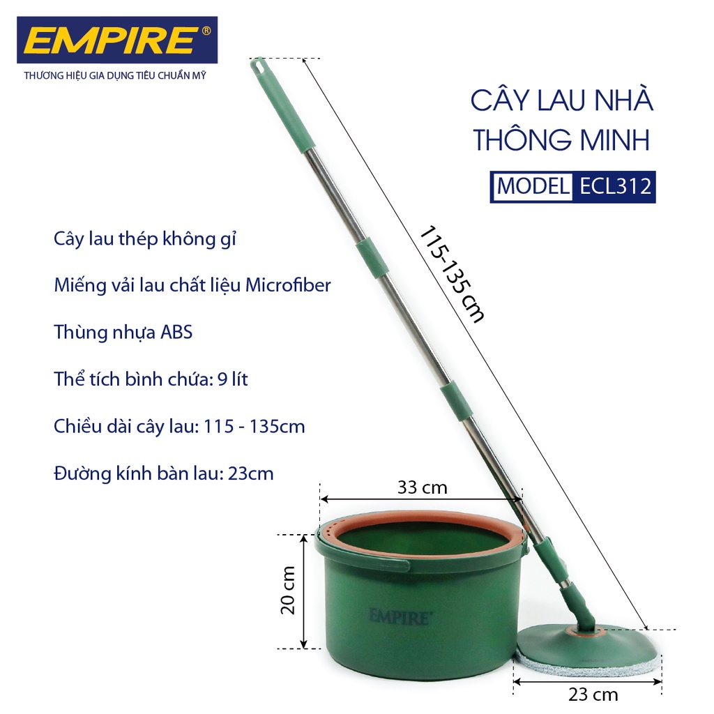 2. THÔNG TIN SẢN PHẨM Cây Lau Nhà Empire ECL312:- Chất liệu: Nhựa ABS cao cấp- Miếng lau Microfiber thấm hút cực tốt: 2 miếng bông lau tròn 23cm- Kích thước thùng nước: 33cm x 20cm- Kích thước cây lau dài: 115 - 135 cm- Kích thước bàn lau: tròn 23cm- Sản phẩm bao gồm: 1 thùng nước, 1 cây lau, 2 miếng bông lau