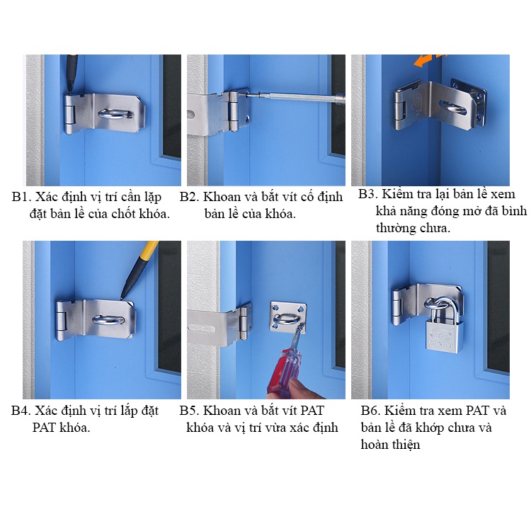 - Sử dụng chốt khóa thẳng có PAT khóa, bản lề cài khóa là sản phẩm cần thiết tăng sự thêm sự an toàn cho bạn và người thân, cũng như bảo quản đồ đạc.