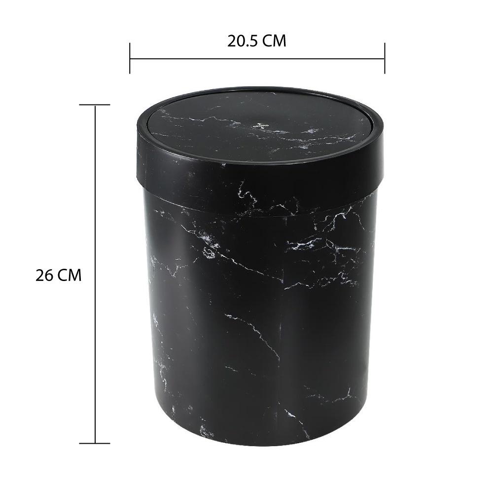 Thùng tròn có họa tiết đá cẩm thạch đen và dung tích 7 lít. Nắp xoay của thùng cho phép bạn bỏ rác dễ dàng. Thùng phù hợp để đựng rác thải khô và sử dụng trong nhà.- Mẫu đá cẩm thạch đen.