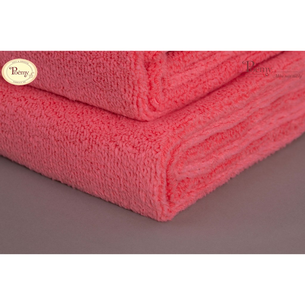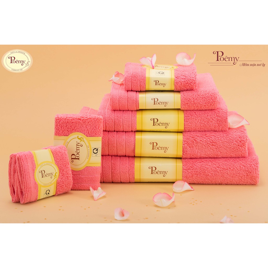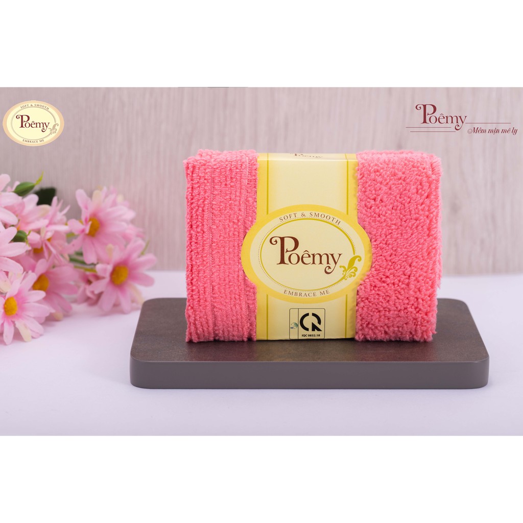 - Poêmy được làm từ 1 loại sợi tổng hợp siêu vi mảnh. Trong 1 sợi siêu vi này lại chứa rất nhiều những sợi vô cùng nhỏ. Kích cỡ của sợi trong khăn Poêmy chỉ bằng 1/250 (1 phần 250) sợi tóc với mật độ vô cùng dày đặc khến chiếc khăn siêu mềm, siêm mịn, vô cùng dịu êm.