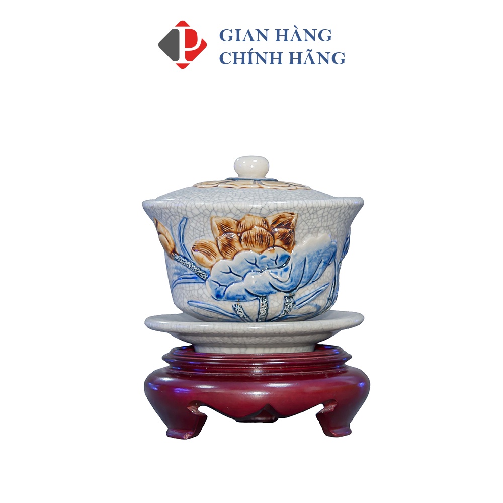 Bát nước men Rạn Đắp Nổi họa tiết SEN, đồ thờ cúng Phùng Gia - Gốm sứ Bát Tràng cao cấp