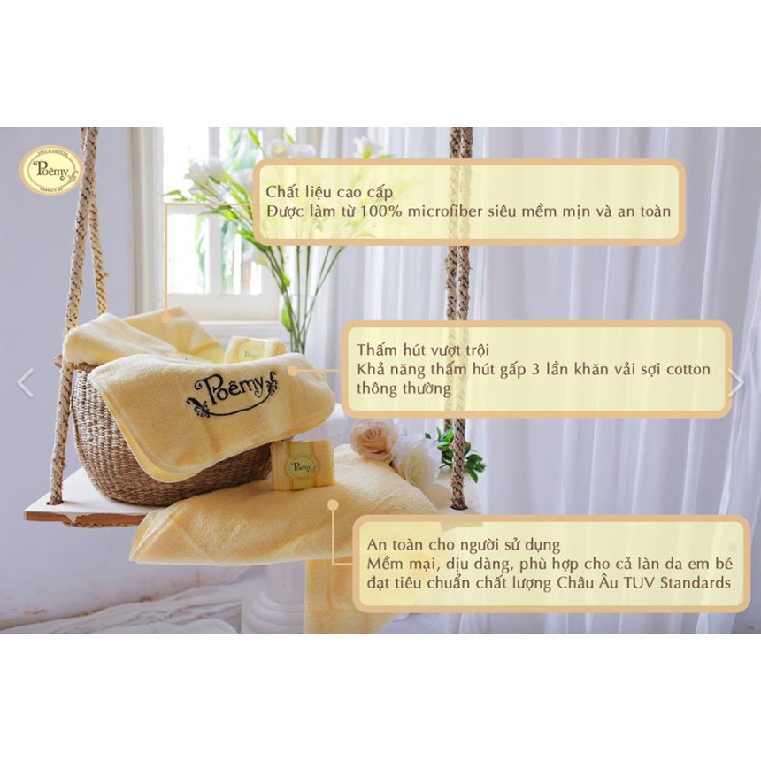 - Khăn Poêmy làm sạch rất sâu, sợi vải len lỏi, cuốn đi mọi bụi bẩn môi trường tích tụ trong từng lỗ chân đem đến một khuôn mặt sạch sẽ, tươi sáng.