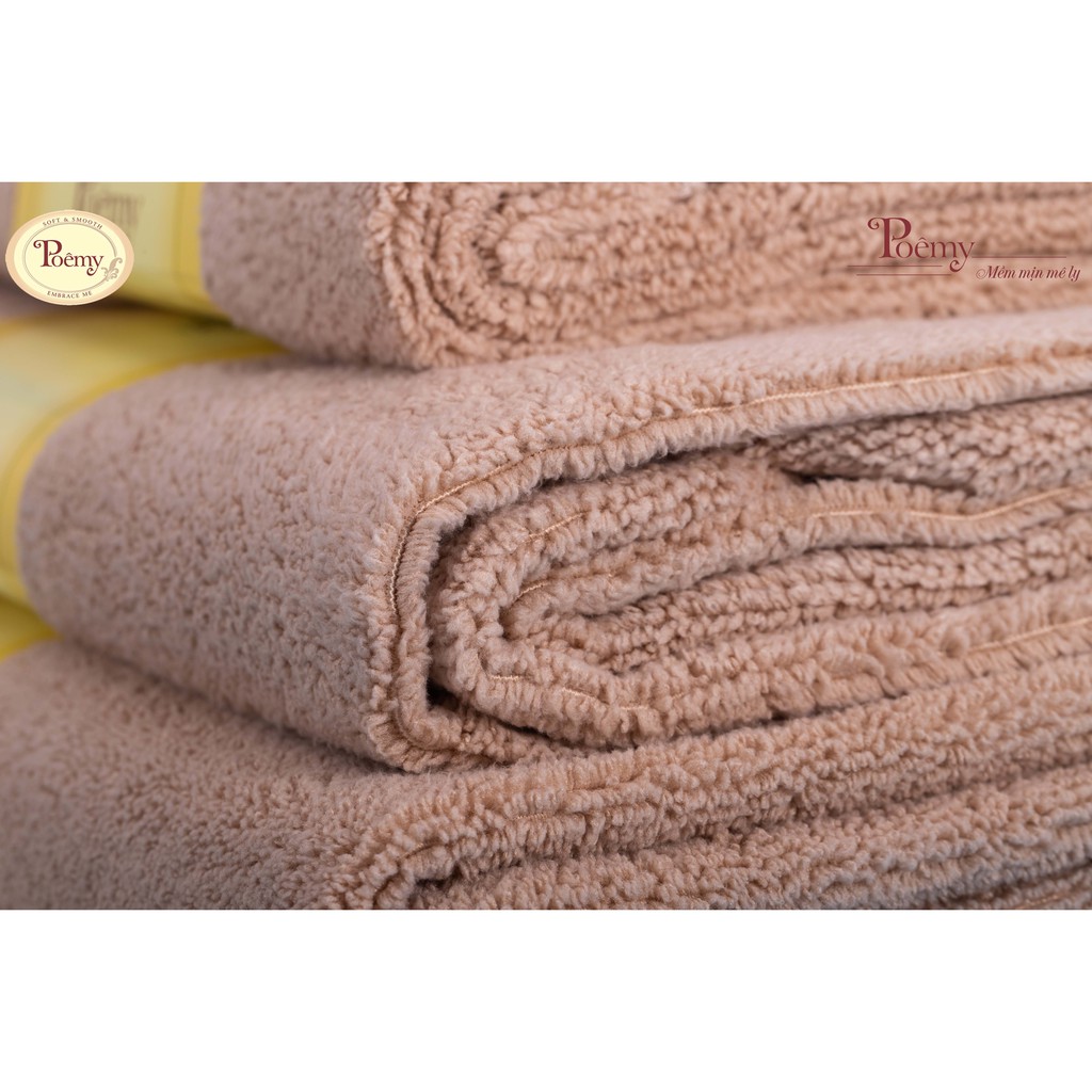 - Poêmy được làm từ 1 loại sợi tổng hợp siêu vi mảnh. Trong 1 sợi siêu vi này lại chứa rất nhiều những sợi vô cùng nhỏ. Kích cỡ của sợi trong khăn Poêmy chỉ bằng 1/250 (1 phần 250) sợi tóc với mật độ vô cùng dày đặc khến chiếc khăn siêu mềm, siêm mịn, vô cùng dịu êm.
