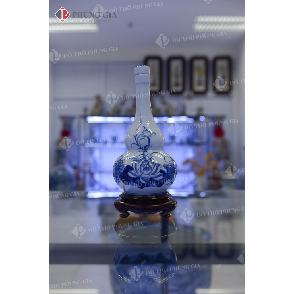 Giới thiệu Nậm rượu 2 bầu Men Lam Trắng Trơn họa tiết SEN - đồ thờ cúng Phùng Gia