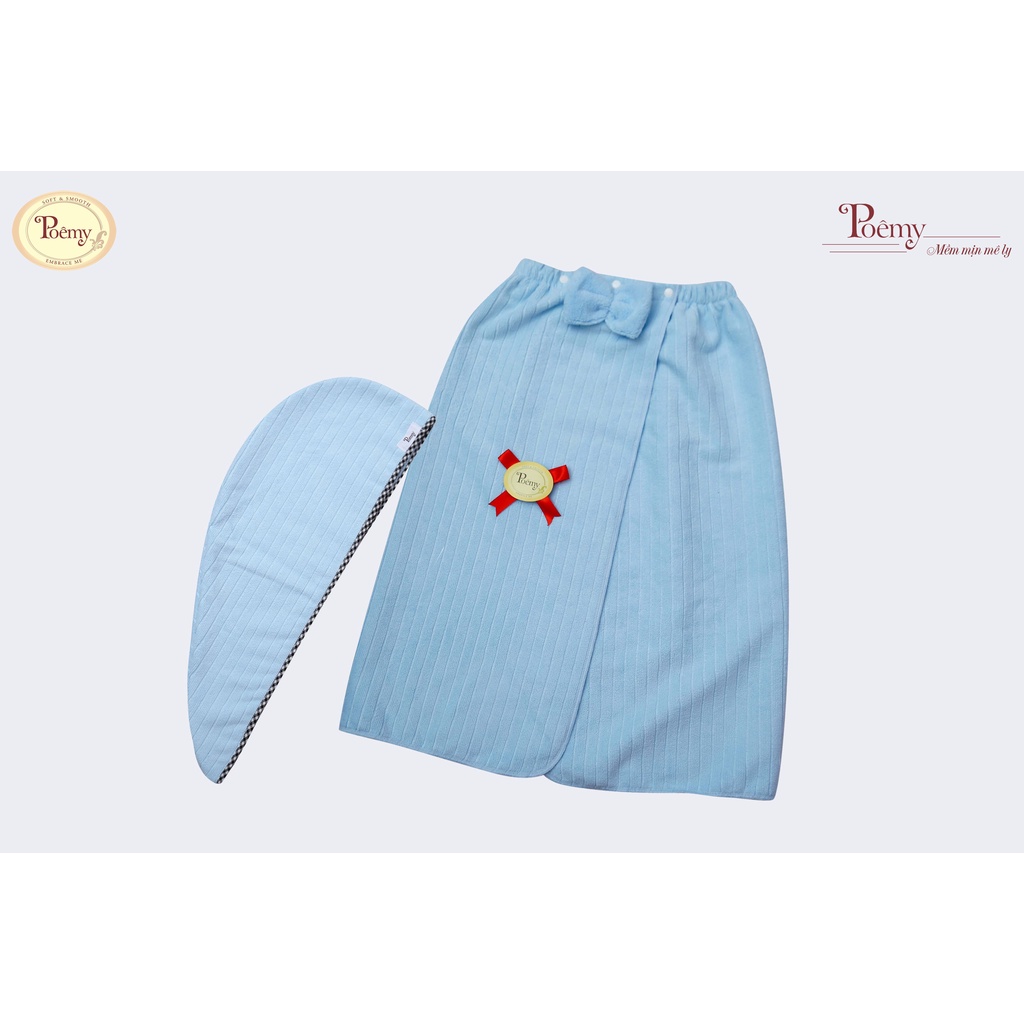 Váy quây spa, phòng tắm cao cấp Poemy không túi sọc gân KT(70x120)Mũ quấn tóc thấm hút nước gấp 7 lần trọng lượng khăn KT 23x65