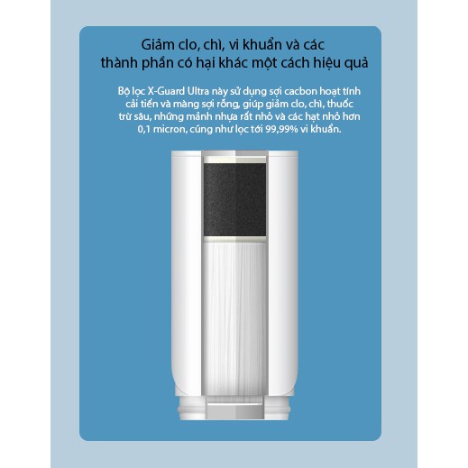 Bộ lọc X-Guard Ultra này sử dụng sợi cacbon hoạt tính cải tiến và màng sợi rỗng, giúp giảm clo, chì, thuốc trừ sâu, những mảnh nhựa rất nhỏ và các hạt nhỏ hơn 0,1 micron, cũng như lọc tới 99,99% vi khuẩn.
