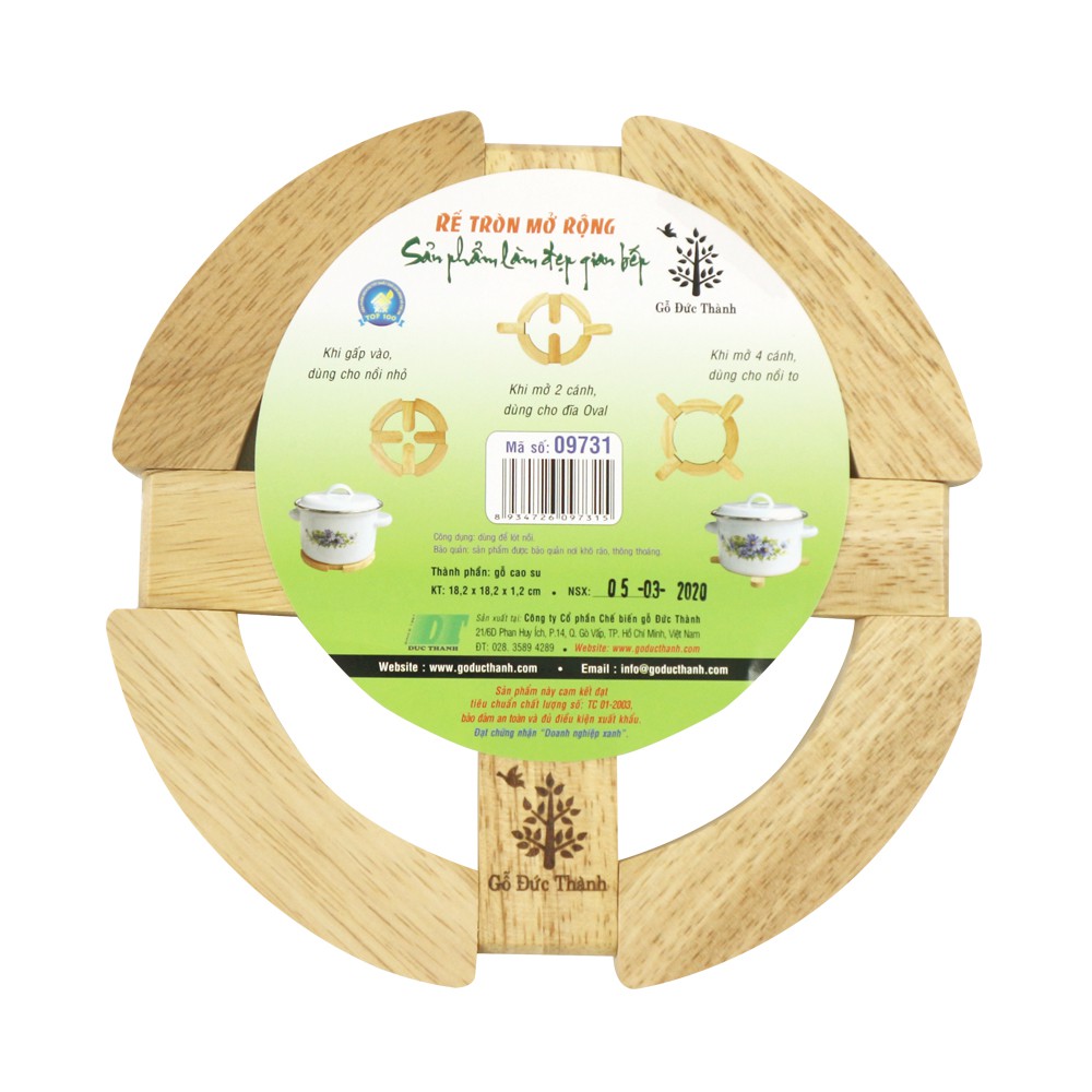 Rế lót nồi hình tròn mở rộng Gỗ Đức Thành 09731Rế lót nồi hình tròn mở rộng được làm từ gỗ cao su, có bề mặt nhẵn mịn, khả năng chịu nhiệt và chịu lực tốt và có độ bền cao. Rế lót nồi hình tròn mở rộng được thiết kế có các rãnh để tạo sự ma sát giúp các đồ dùng không bị trơn tuột nhằm đảm bảo tối đa sự an toàn cho người sử dụng. Ngoài ra, các rãnh này còn giúp làm thông thoáng nhiệt, khi chúng ta đặt nồi nóng lên trên.