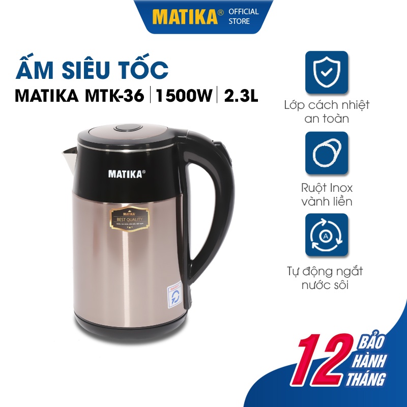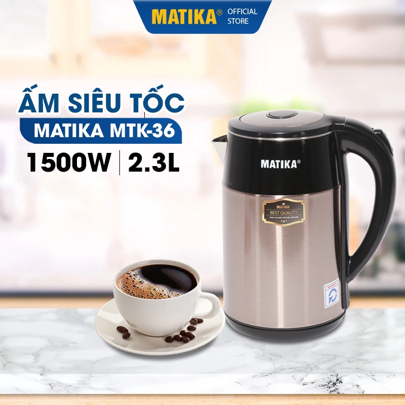 Ấm Siêu Tốc MATIKA 2.3L MTK-36Ấm siêu tốc Matika MTK-36 thiết kế sang trọng được làm từ chất liệu inox 304 bền đẹp, dung tích 2.3L cùng công suất 1500W đáp ứng nhu cầu nước nóng để pha trà, úp mì,...nhanh chóng.