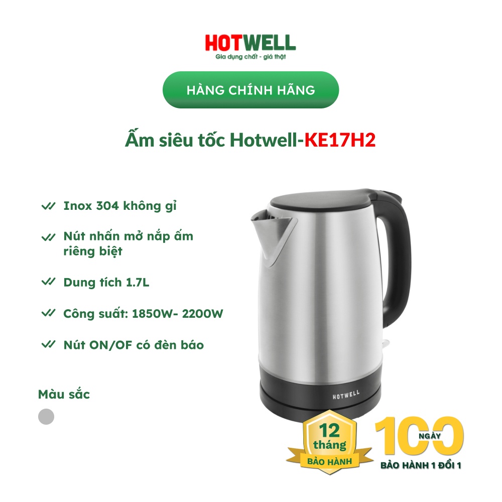 Hotwell là thương hiệu gia dụng Việt thuộc Công ty Cổ phần Masscom Việt Nam - một trong 500 công ty công nghệ lớn nhất Việt Nam. Hotwell là hãng gia dụng đầu tiên có chế độ hậu mãi tuyệt vời chưa từng có hiện nay: sản phẩm được cam kết bảo hành 1 đổi 1 mới trong 100 ngày sau khi mua cùng thời gian bảo hành lên tới 12 tháng, giúp người mua hoàn toàn an tâm khi dùng ấm siêu tốc Hotwell KE17H2Ấm siêu tốc Hotwell KE17H2 được sản xuất từ chất liệu inox 304 cao cấp và có khả năng đun sôi nước nhanh chóng, đồng thời giữ nhiệt hiệu quả trong hàng giờ liên tục chắc chắn sẽ là lựa chọn không thể thiếu trong căn bếp nhà bạn.